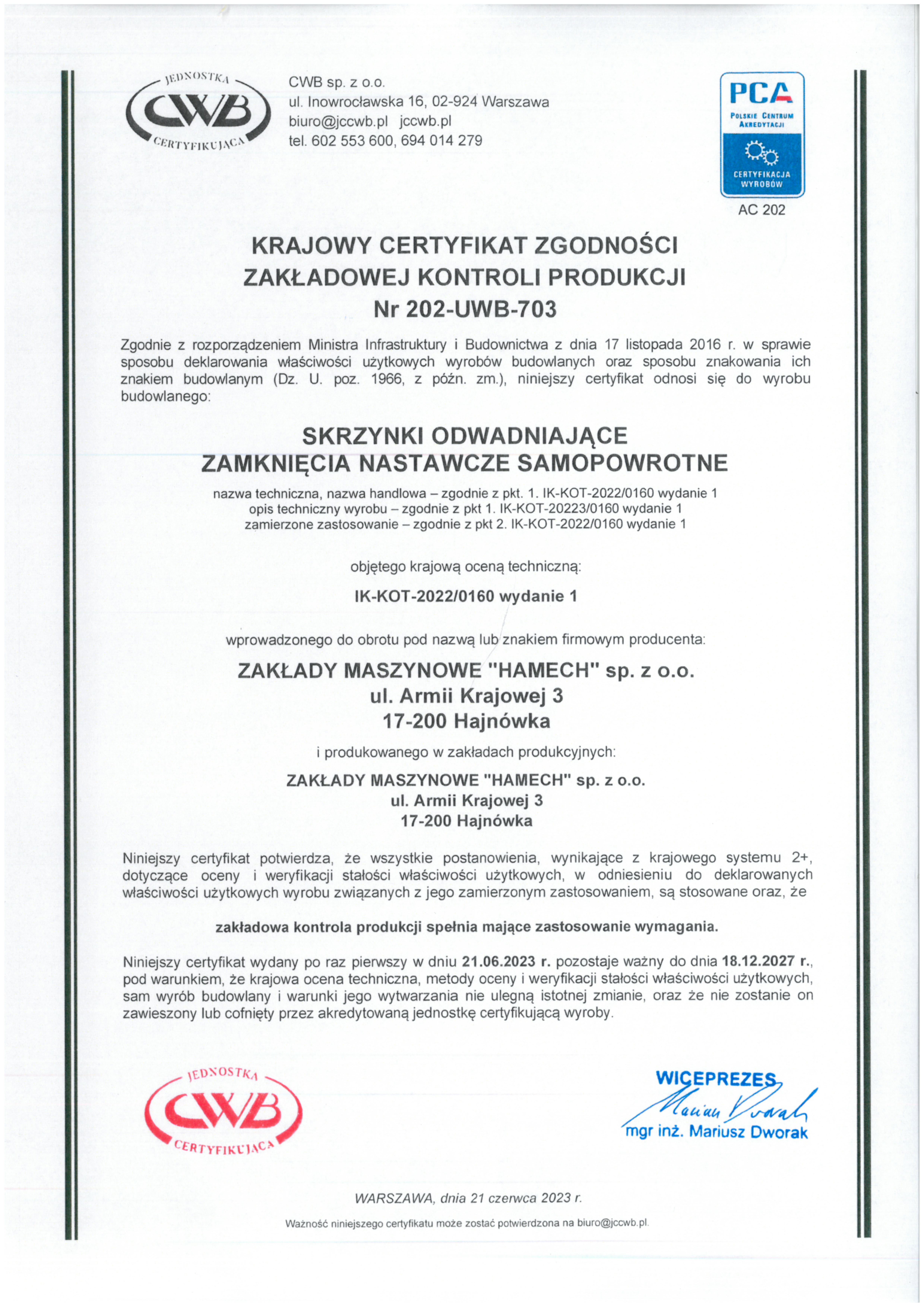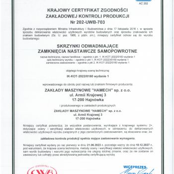 Niedawno odebraliśmy krajowy certyfikat zgodności zakładowej kontroli produkcji. Otrzymanie go jest dowodem, że spełniamy wszystkie wymogi i normy dotyczące jakości produkcji skrzynek odwadniających i zamknięć nastawczych samopowrotnych.